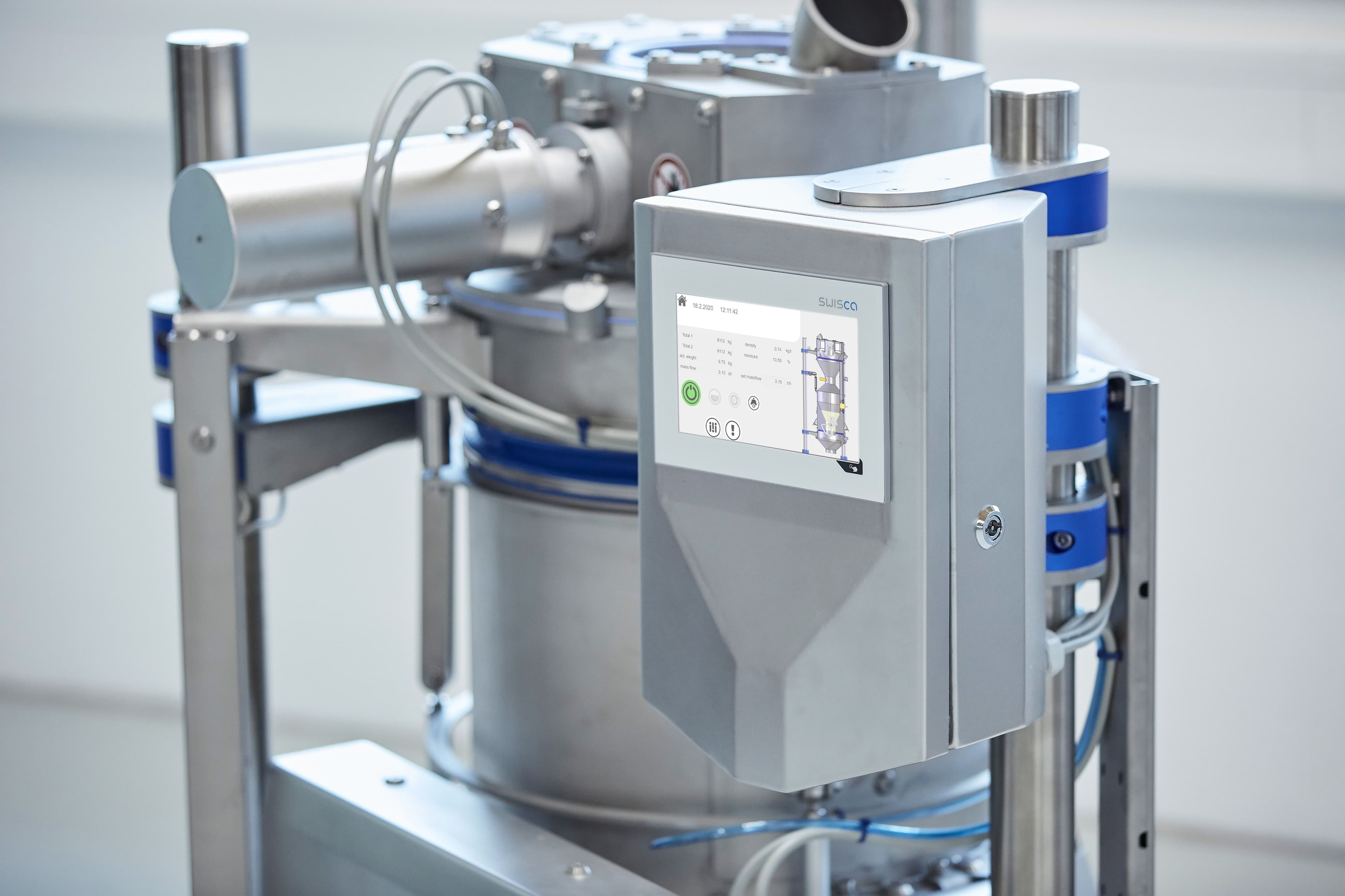 Ein wichtiger Produktionsprozess in einer Mühle zur Herstellung von Mehl ist das Befeuchten, um eine gleichmässige Vermahlung und eine hohe Ausbeute zu gewährleisten. Das Getreide wird so für einen optimalen Mahlzustand vorbereitet. Durch die Zugabe von Wasser zum Getreide und die Temperierung in den Silos werden die Kleie-Schichten zäh und elastisch und der Endosperm im Inneren des Korns wird weich gemacht. Dies ist die optimale Voraussetzung, um beim Mahlen die Schale und den Endosperm möglichst effizient voneinander zu trennen. Mit der Erfindung von SWISCA können Feuchtigkeit und Dichte bereits während der Verwiegung präzise gemessen und die Wasserzugabe exakt kalkuliert werden. Ein völlig neues Verfahren mit minimalem Energiebedarf bringt die Feuchtigkeit mit einem Wassernebel auf die Oberfläche der Körner auf. Die Maschine, die zusammen mit der St. Galler Trinox Engineering AG entwickelt wurde, wird zudem mittels Clean-in-Place-Technologie für eine optimale Lebensmittel-Sicherheit automatisch gereinigt.